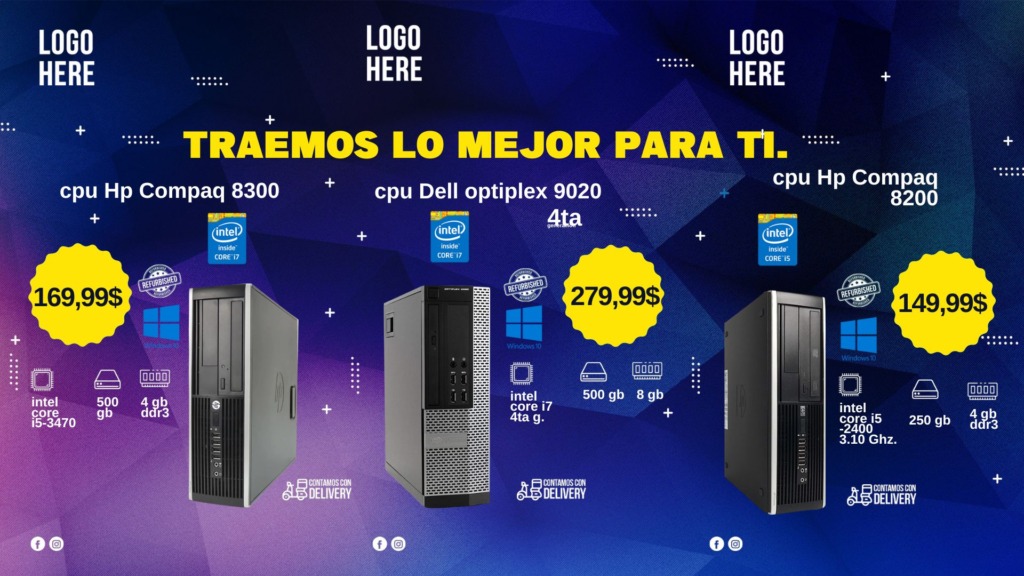 Para promocionar componentes de alto valor como una CPU (Unidad Central de Procesamiento) en tu tienda de computación, necesitas gráficos de venta rápidos y de alta calidad. Si estás buscando “Banner oferta de cpu para tu tienda de computacion editable en canva,” esta plantilla es la solución perfecta. Olvídate de programas complejos: este banner es 100% editable en Canva. Podrás personalizar las especificaciones técnicas, los precios y el diseño en minutos, asegurando que tus ofertas de hardware se lancen de inmediato y luzcan profesionales.
