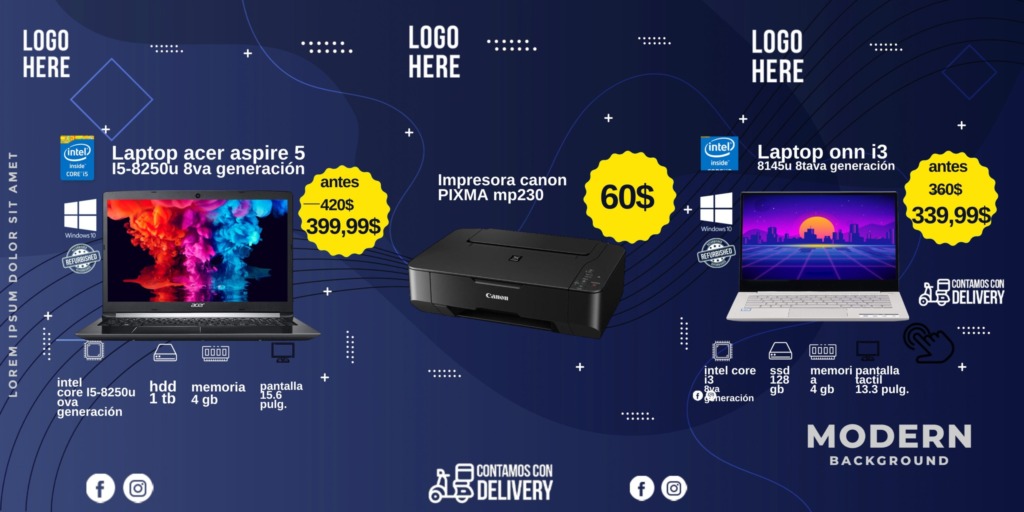 - Edita las capas y textos: Haga clic en cualquier cuadro de texto para ingresar los nombres de los productos, los precios de oferta y la duración de la promoción. Suba imágenes nítidas de sus computadoras, laptops o accesorios.